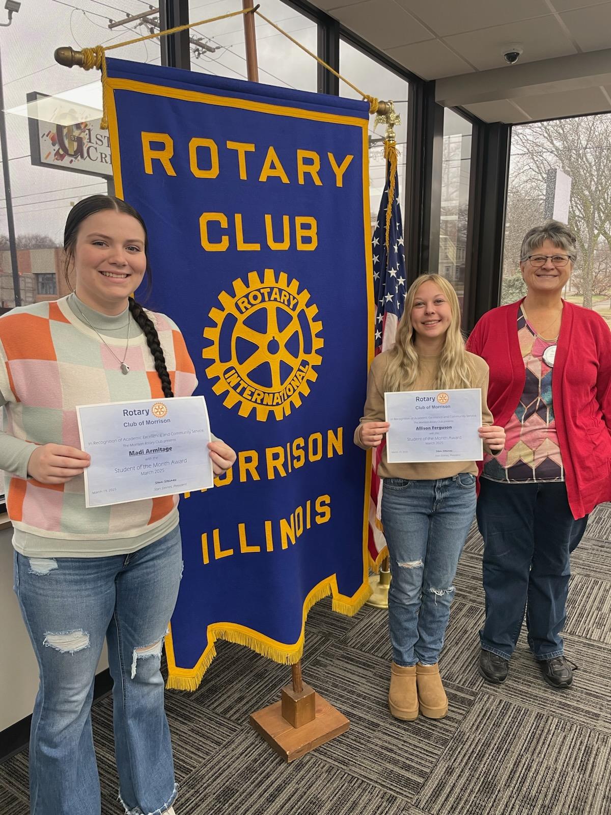 Morrison Rotary MHS March Students of the MonthMorrison Rotary Club welcomes March Students of the Month Our March 2025 students of the month are Morrison High School seniors Alli Ferguson and Madi Armitage. Alli is the daughter of Angie and Shane Ferguson. She has participated in Key Club for 2 years, a member of FFA for 4 years and was a cheerleader for 3 years. FFA has given her opportunities to assist with meal drives and also rake yards. Her hobbies are baking, crafts, playing legos, fishing, riding 4-wheelers and spending time with family members. She has been working at the Morrison Vet Clinic which has fueled her passion for Veterinary Medicine. She will attend Blackhawk College for 2 years and then continue her education at UW Platteville. Madi is the daughter of Leslie and Andy Harridge and Dan and Jessica Armitage. She has participated for 4 years in Volleyball, Basketball, Softball and Student Council and B.L.I.N.D for the last 2 years. She loves to volunteer at the schools especially Northside. She loves to color and draw and hang out with the kids at Northside School and working with her intern class. She received a softball athletic scholarship at Sauk Valley College where she will major in Elementary Education and minor in Psychology. She then plans to transfer to Illinois State to continue her education. Well done ladies! Pictured (left-right) Madi, Alli and President-Elect Ellen Smith |